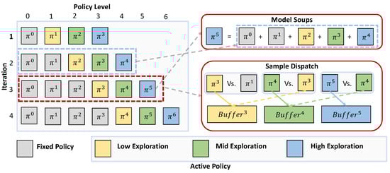 here, is a hyperparameter that controls the strength of the entropy regularization. As training progresses, decreases in tandem with the shift of policies from high-active to low-active levels, with the highest-level policy having the largest value and the lowest-level policy having the smallest. This synchronized reduction of ensures that exploration is encouraged early in the training, while policies progressively focus more on exploitation as they transition towards lower activity levels. This mechanism effectively maintains a balance between exploration and exploitation across different policy tiers, ensuring that agents explore sufficiently in the early stages, while refining and exploiting learned strategies in the later stages.