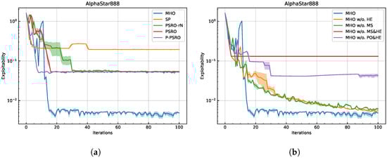 The experiments in AlphaStar888. (a) Main experimental results comparing different algorithms, with exploitability plotted against training iterations. (b) Ablation experiment on AlphaStar888 comparing the performance of the MHO, with exploitability plotted against training iterations.