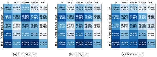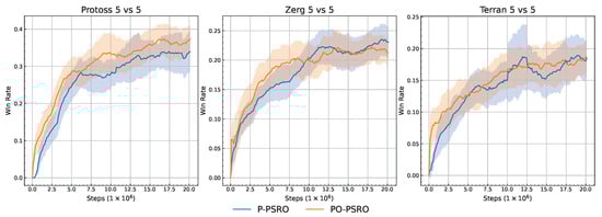 In MiniStar, to benchmark performance, pairwise matches are conducted among the models produced by each algorithm, and the resulting win rate matrix is reported. This direct comparison allows us to quantitatively assess the relative strengths of the different methods. The experimental results are presented in Figure 3. The MHO consistently outperforms the baseline methods (PSRO, PSRO-rN, P-PSRO, and SP) in all three races (Protoss, Zerg, and Terran) in 5v5 settings, achieving the highest expected win rate. In addition, throughout the training process, each algorithm’s policy is periodically evaluated against built-in AI. The win rate curves from these evaluations serve as an indirect measure of the training progress, providing further insights into how each algorithm evolves over time. The experimental results are presented in Figure 4. Compared to other parallelized methods (P-PSRO, PSRO-rN), the MHO exhibits faster convergence and superior final performance, demonstrating improved training efficiency and strategic effectiveness. Overall, the MHO maintains a higher win rate.