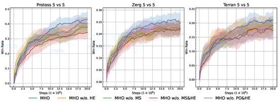Ablation experiments against built-in AI in the MiniStar environment. Winning curves of various ablated versions of the MHO against the built-in AI. The x-axis indicates the number of training steps, while the y-axis denotes the corresponding win rate.