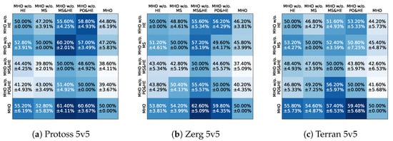 Ablation experiments in the MiniStar environment. Pairwise win rate matrices evaluating MHO without certain components in 5v5 combat scenarios of MiniStar. Subfigures show (a) Protoss 5v5, (b) Zerg 5v5, and (c) Terran 5v5. Each cell shows the row player’s expected payoff against the column player’s strategy. Larger positive values (darker coloration) indicate stronger performance of the row strategy against the column strategy.