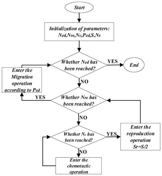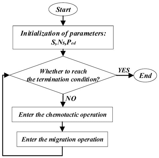 Furthermore, the bacteria are susceptible to abrupt shifts in the environmental conditions, such as sudden temperature spikes or exposure to water impacts, and this may result in either the demise of the bacteria or their migration to another viable habitat when the environment becomes unsuitable for bacterial proliferation. The migration operator is introduced in the BFO algorithm to simulate this feature. The bacterium will be randomly migrated to a new position in the search space when the random number generated by the individual falls below the predetermined migration probability Ped. The migration operator ensures that the bacterium will not be limited by the local optimal solution. The flowchart of the BFO algorithm is shown in Figure 1.