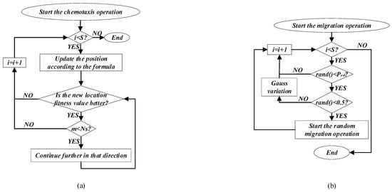 In the improved bacterial foraging algorithm, the new position of the i-th bacterium is influenced by multiple factors, including its current position , a randomly selected position superior to the current one , and the global optimal position . The rand represents a random number evenly distributed between (0, 1). Its guidance will stem from both its present position and a randomly selected global position if the bacterium happens to be the current optimal individual. This adjustment ensures the comprehensive utilization of the information carried by the dominant individuals and facilitates the fast convergence of the algorithm. The flowchart of the chemotaxis operation of the IBFO algorithm is shown in Figure 3a.