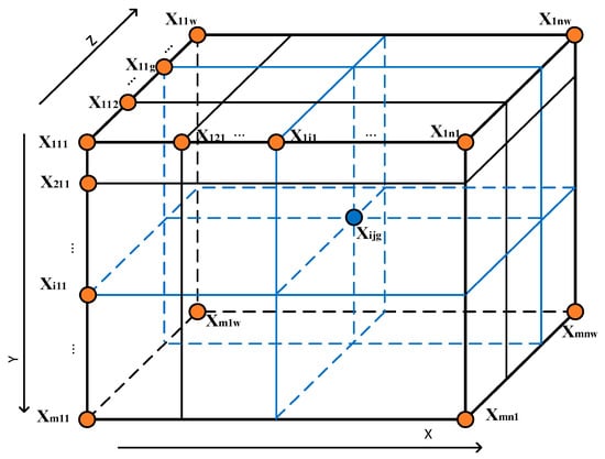 In Formula (17), the represents the three-dimensional position matrix of the l-th bacterium. In Formula (18), is a numerical matrix corresponding to a certain type of resource. The three-dimensional array is shown in Figure 4, where the x-axis direction represents the disaster site dimension, the y-axis represents the rescue site dimension, and the z-axis represents the type of resources. The point in Figure 4 represents the quantity of g-resource from rescue site to disaster site . The form of a three-dimensional array is used for storage when programming, which facilitates efficient operation and processing. Each individual is expanded into a one-dimensional array when the population is updated.