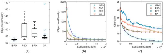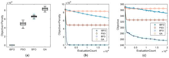 The convergence curve without the penalty value is shown in Figure 5c. The total optimal value was updated based on Formula (20), which contains the penalty part, but the partial curves reciprocated those that only used objective values. It can be clearly seen from Figure 5 that better convergence speed and solution accuracy were obtained using the IBFO algorithm.