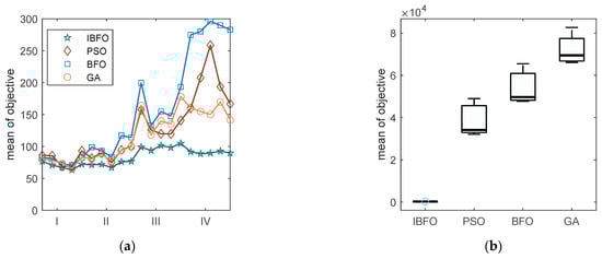 Since the mean values of the objective obtained using the four algorithms in the fifth set of instances were quite different, the comparison of the mean values of the first four groups and the last group of instances were presented separately, as shown in Figure 8. The mean values from 20 runs obtained using the four algorithms in instances I–IV are shown in Figure 8a. It can be seen that the difference between the mean values of the four algorithms in the first and second sets of instances was relatively small. With the increase in the instance scale, the mean values obtained using each algorithm increased to different degrees, especially the BFO algorithm, because the results were mostly infeasible and there were penalty parts. The PSO algorithm performed well on small-scale problems and in a few instances could obtain a minimum that was better than the IBFO algorithm; however, the optimization ability also decreased significantly with the increase in scale. In the four sets of instances regarding different scales, better results could still be obtained using the IBFO algorithm. The mean values for the four algorithms in instance V were shown in Figure 8b. The IBFO algorithm solutions had the lowest spread and median, indicating not only the best average performance but also the most stable optimization ability across all large-scale instances. The optimization ability, solution accuracy, and stability of the IBFO algorithm are stronger than those of the other algorithms. It can be concluded from various pieces of statistical information that these improvement measures can be effectively utilized in the scheduling model proposed.