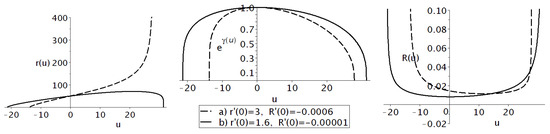 The general solution of the system (4) is a hard problem. Nevertheless, under the conditions discussed above, the extra-dimensional metric depends only on the radial coordinate u of the extra space. This greatly simplifies the analysis so that non-trivial numerical results can be obtained. We refer the reader to the system of differential Equations (6)–(11) written in [41]. The brane position depends on a certain solution which is characterized by additional conditions: specific values of metric functions and their derivatives at the point . We choose without loss of generality.