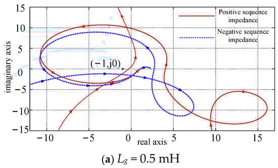 Figure 4 shows the Nyquist diagrams of the grid-connected system’s Hvp(s) and Hvn(s) under different weak grid conditions, and Table 1 shows the analysis of the Nyquist diagram in Figure 4. Among them, the red solid line represents the system’s positive sequence impedance ratio Hvp(s), and the blue dashed line represents the system’s negative sequence impedance ratio Hvn(s). When the difference between the number of positive crossings N+ and the number of negative crossings N- of the open-loop frequency characteristic curve of the system in the section of the negative real axis (−1, −∞) multiplied by 2 is equal to the number of right poles of the open-loop system, the closed-loop system is stable. Both Hvp(s) and Hvn(s) have two poles in the right half-plane. Therefore, when the grid-connected system is stable, the Nyquist curves of both Hvp(s) and Hvn(s) should cross the negative real axis to the left of the point (−1, j0) positively once. It can be seen from Figure 4 that as the grid becomes weaker, the Nyquist curves of Hvp(s) and Hvn(s) each cross the negative real axis to the left of the point (−1, j0) positively once. From this, it can be concluded that the grid-connected system with the active damping link added can operate stably under weak grid conditions.