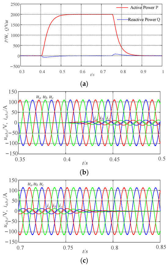 In Figure 5, at 0 s, the system operates at rated conditions, with the output P and Q tracking the given power values of Pref and Qref. Following a sudden drop in the grid angular frequency of 0.2 π rad/s at 0.4 s, the output P of the system increases to 2000 W, accompanied by changes in the grid-side current. At 0.75 s, when the grid angular frequency is restored to its rated state, the output P returns to the set value, and the grid-side current also reverts to its initial condition. During the fluctuations in grid frequency, the VSG can adjust its active output through primary frequency control, ensuring the stability of the system. The variations in output voltage and grid-side current are consistent with changes in the system’s active power, indicating that the VSG control strategy proposed in this paper is effective in participating in grid frequency regulation.