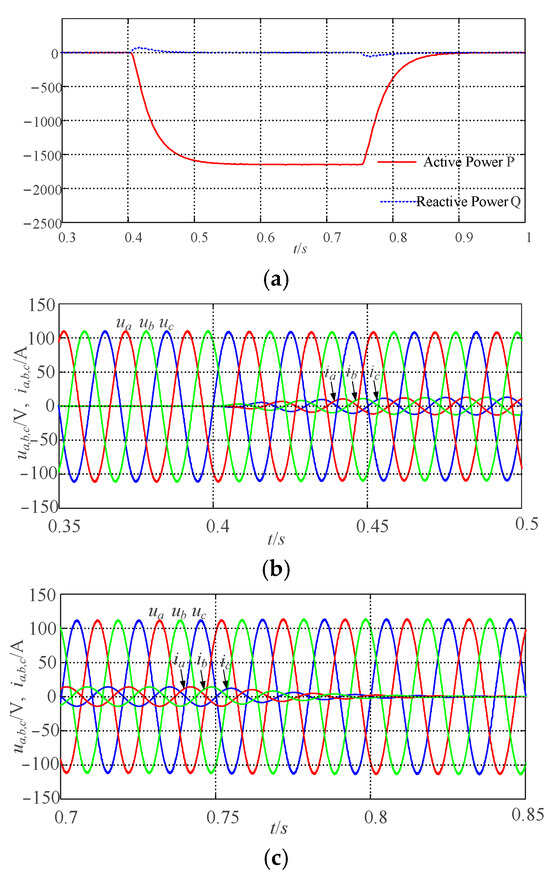 As shown in Figure 6, at 0 s, the grid-connected system operates at rated conditions, with the output P and Q tracking the specified power values of Pref and Qref. Following a sudden increase in the grid angular frequency of 0.2 π rad/s at 0.4 s, the output P of the grid-connected system decreases to −2000 W, accompanied by corresponding changes in the grid-side current. At 0.75 s, when the grid angular frequency is restored to its rated state, the output P returns to the set value, and the grid-side current also reverts to its initial condition. During fluctuations in grid frequency, the VSG can adjust its active output through primary frequency control, ensuring the stability of the system. The variations in output voltage and grid-side current are consistent with changes in the system’s active power, further demonstrating that the VSG control strategy proposed in this paper effectively participates in grid frequency regulation.