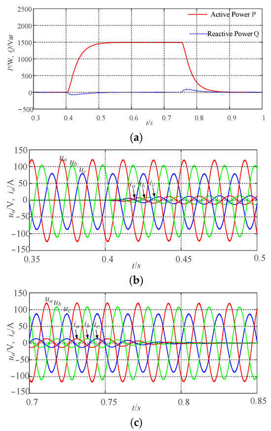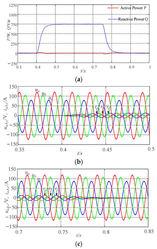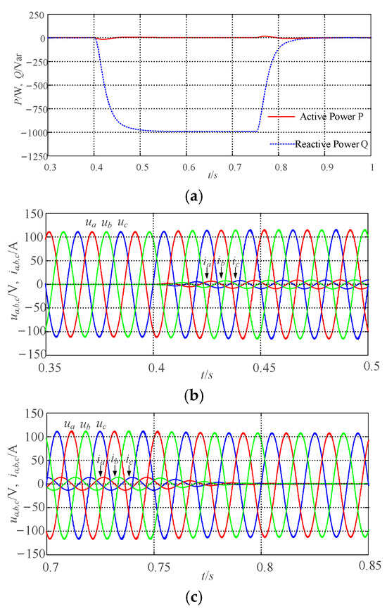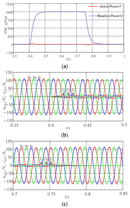 (3) Validation of participation in voltage regulation capability under unbalanced grid conditions: In Figure 10, to verify the system’s voltage support capability under unbalanced grid conditions, at 0 s, the grid-connected system operates at rated conditions, with the output P and Q tracking the specified values of Pref and Qref. Following a sudden drop of 1.875% in the grid voltage amplitude at 0.4 s, the output Q of the system increases to 750 Var, accompanied by corresponding changes in the grid-side current. At 0.75 s, when the grid voltage is restored to its rated state, the output Q returns to the set value, and the grid-side current also reverts to its initial condition. It can be seen that under the conditions of an unbalanced grid, during fluctuations in grid voltage amplitude, the VSG can adjust its reactive output through voltage regulation to ensure the stability of the system. The variations in output voltage and grid-side current are consistent with changes in the system’s Q, indicating that the VSG control strategy proposed in this paper can effectively participate in grid voltage regulation under conditions of three-phase unbalance in the grid.