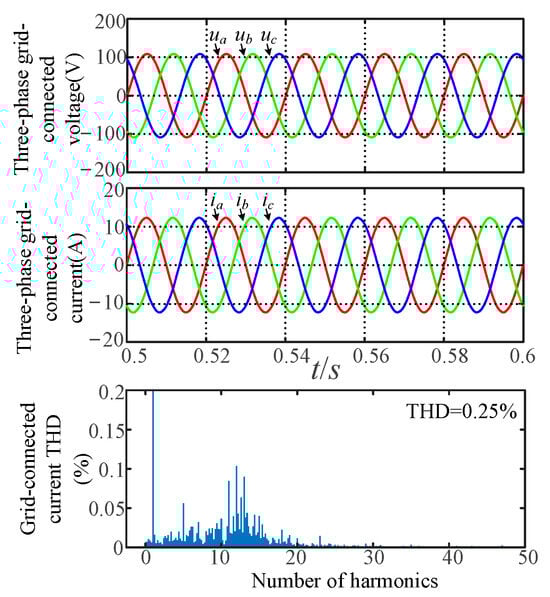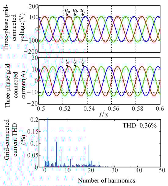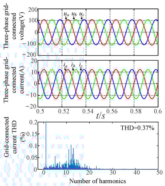From Figure 11, Figure 12 and Figure 13 and Table 3, the grid-forming inverter with VSG control operates stably under all three grid conditions. The three-phase grid currents are sine-balanced and exhibit relatively low Total Harmonic Distortion (THD). Specifically, when Lg = 0 mH, the THD is 0.25%; when Lg = 1.5 mH, the THD is 0.36%; and when Lg = 3 mH, the THD is 0.37%. These values meet the grid connection requirements.