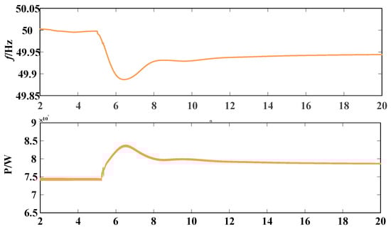 When the system reaches a steady state, at t = 5 s, there is a sudden increase in active load in the power grid, and the corresponding frequency fluctuation curve and inverter output active power change are shown in Figure 15. After the sudden change occurs, the inverter starts to increase power to suppress the frequency drop. Finally, at t = 12 s, the inverter increases active power by 10 MW, and the frequency stabilizes at 49.925 Hz, achieving active support for the power grid frequency.