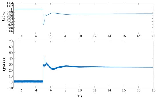 When the system reaches a steady state, at t = 5 s, there is a sudden increase in reactive load in the power grid, and the corresponding voltage fluctuation curve and inverter output reactive power change are shown in Figure 16. After the sudden change occurs, the inverter starts to increase reactive power to suppress the voltage drop. Finally, at t = 18 s, the inverter increases reactive power by 25 MVar, and the voltage stabilizes at 0.97 p.u, achieving reactive support for the power grid voltage.