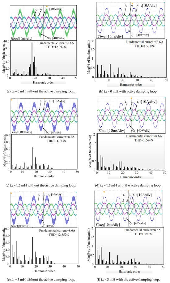 Figure 17 shows the comparative experimental waveforms of the grid-connected system when the grid impedances are Lg = 0 mH, 1.5 mH, and 3 mH with and without the active damping loop. From Figure 17a,c,e, it can be observed that when the system does not include the active damping loop, the THD of the grid current changes little with increasing grid impedance and does not meet the grid connection requirements, exhibiting significant resonance phenomena. In contrast, Figure 17b,d,f show that after incorporating the active damping loop, the resonance phenomena of the grid-connected inverter are effectively suppressed compared to the case without it. At this point, for the three different grid impedance scenarios, the THD of the grid current is 1.518%, 1.7664%, and 1.790%, respectively, which shows significant improvement compared to the THD values under the same conditions without the active damping loop. All these values meet the grid connection requirements, indicating that the system has good current quality.
