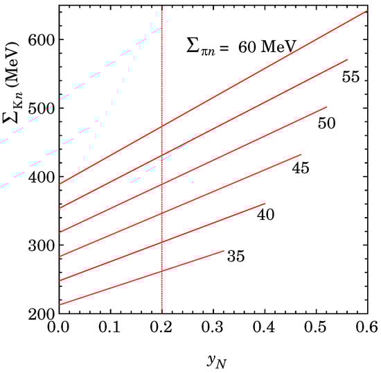 Once is given, and () are determined from Equations (31) and (39), respectively. Then, is obtained from Equation (30b) together with , which is given as a function of through Equation (40). With the nonlinear effect , is represented as . In Figure 1, the K-neutron sigma term as a function of is shown at a fixed value of considering uncertainty ranging from 35 MeV to 60 MeV. The vertical dotted line shows boundaries of the allowable region for , taken from [46,47,48].