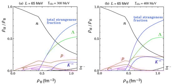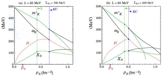 By the use of Equation (2), the Lagrangian density (1) is separated into the kaon part and the baryon part in the mean field approximation: . For , one reads [34,36]: