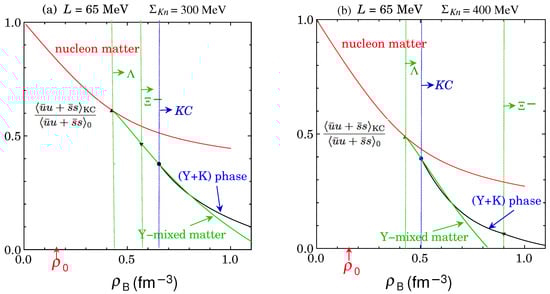 Along with the development of strangeness nuclear physics involving kaons, mesons, and hyperons, a possible existence of KC has been suggested as a novel hadronic phase with multi-strangeness [7]. It has been shown that the s-wave KC is formulated model-independently with a framework of current algebra and the partial conservation of axial-vector current (PCAC) [8] in the context of both the EOS and weak reactions. Subsequently, a coexistent phase of KC and hyperon (Y)-mixed matter [(Y+K) phase] has been considered in the relativistic mean field (RMF) theory [25,26,27], in the effective chiral Lagrangian for kaon (K)–baryon (B) interaction [28,29,30], density-dependent RMF theory [31,32,33], and an effective chiral Lagrangian coupled to the RMF and three-baryon repulsion [34,35,36]. The driving force of kaon condensation is brought about by both the s-wave K-nucleon (N) scalar interaction simulated by the sigma term and the s-wave K–N vector interaction corresponding to the Tomozawa–Weinberg term. not only specifies the scale of explicit breaking of chiral symmetry, but also is related with the quark contents in the nucleon. The onset density of KC, , has been estimated to be = (3–4) with the nuclear saturation density (=0.16 ), depending on the value of . Beyond the onset density, the kaon-condensed phase in hadronic matter develops, accompanying the softening of the equation of state (EOS) at high densities, and it is eventually considered to move to a chiral-restored phase. Thus, the KC may be regarded as a pathway from hadronic matter to strange quark matter and may affect properties of the condensate in dense matter, which is an order parameter of chiral restoration.