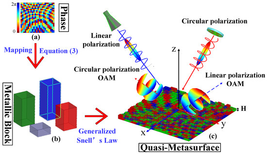 Process of generating a quasi-metasurface: (a) phase, (b) metallic block, (c) manipulation of linear- and circular-polarization vortex.