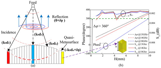 The generalized Snell’s law can be employed to calculate the wavefront difference between the feed source and the target plane. Subsequently, the resonance principle and the PB phase principle can be utilized to compensate for the wavefront differences under linearly and circularly polarized conditions. The quasi-metasurface model employs symmetrical metallic columns with nearly full reflection to directly compensate for the wavefront difference (height), achieving simultaneous manipulation of both linearly and circularly polarized waves [25,26].