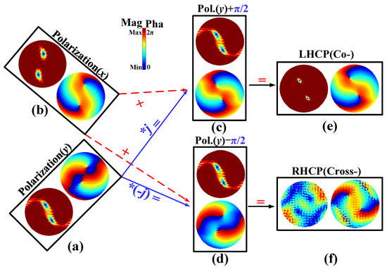 Reflected performance and process: (a) x-polarization, (b) y-polarization, (c) y-polarization + π/2, (d) y-polarization − π/2, (e) LHCP, and (f) RHCP.