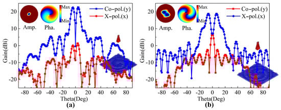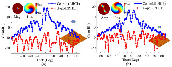The amplitudes and phases of the first- and second-order vortex waves in Figure 4a,b, respectively, show significant phase vortex phenomena. Additionally, the amplitudes of the first- and second-order vortex waves formed one and two (merged) central nulls, respectively. Furthermore, the co- and cross-polarization gains of vortex waves of different orders show that with phase compensation and manipulation, the maximum gain could be higher than 20 dBi. However, as the order of the vortex waves increased, the co-polarization gain gradually decreased, whereas the cross-polarization gain remained relatively low. The aforementioned results for linearly polarized waves also provide valuable references for subsequent studies on circularly polarized vortex waves.