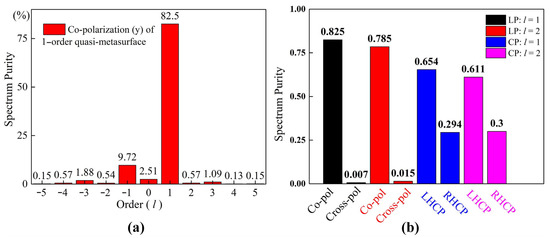 Spectrum purity of vortex waves: (a) co-polarization of first-order quasi-metasurface, (b) co- and cross-polarization of four quasi-metasurfaces.