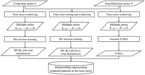 Figure 1 illustrates the overall methodological frame diagram of the proposed model. Initially, the model addresses system uncertainty through time series fuzzification, which is followed by a threefold identification of temporal patterns through the integration of BN structure learning and fuzzy relationship modeling. Temporal patterns concealed in fuzzified time series are captured by forming FLRs and FLRGs. BN structure learning discovers crisp dependencies in the crisp time series. Moreover, temporal patterns between historical fuzzified data and predicted crisp data are represented by fuzzy–crisp dependences in the mix of fuzzified and crisp time series using BN structure learning. An improved relationship uncertainty modeling strategy is introduced, which involves computing fuzzy empirical probabilities as weights for FLRGs to quantify fuzzy relationship uncertainty, alongside BN parameter learning to estimate node CPDs, thus describing uncertainties for crisp and fuzzy–crisp dependencies. A novel hybrid model inference strategy is proposed, involving the search for weighted FLRGs and the estimation of posterior distributions for crisp observations at predicted moments using BN inference. Finally, a novel defuzzification method is designed to effectively integrate various relationships and their associated uncertainty information.