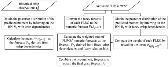 Input: —historical crisp observations for the predicted moment t, —activated BN-PWFLRGs, —the i-th BN-PWFLRG in , —historical fuzzified data for , —the BN with crisp dependencies, —the BN with fuzzy–crisp dependencies. Output: Numerical forecast . - 1: