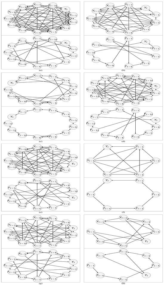 (2) Relationship establishment: Most FTSF models primarily consider fuzzy relationships involving fuzzified data from historical moments to predicted moments. In numerous real-world scenarios, a time series presents diverse temporal patterns, calling for a model to describe these relationships from different perspectives, as fuzzy relationships alone may not adequately reflect the temporal patterns in time series. It is possible to enable a more accurate description of the complex relationships in time series and reduce prediction errors by combining FTSF models with a BN. We can construct three different relationships based on crisp and fuzzified data, including fuzzy relationships, crisp dependencies, and fuzzy–crisp dependencies. The details are illustrated in Algorithm 1. The flowchart of temporal relationship construction is presented in