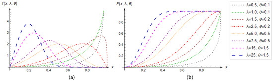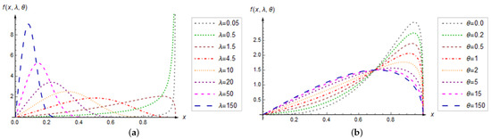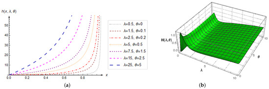 According to the previous theorem, it follows that the function vanishes at , while at it has a dual behavior, given by the second of Equations (3). At the same time, the shape of the QHU distribution depends only on the parameter λ, where the edge case , as well as , give a monotonically increasing PDF. Thus, λ is the shape parameter of the QHU distribution (see also Remark 2). This can be seen in Figure 1a, which shows plots of the PDFs for various parameter values . In this way, the significant flexibility of the QHU distribution with respect to changes in its parameters is noticeable.