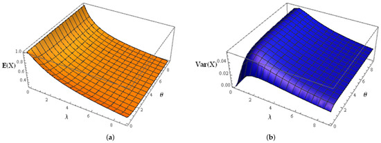 The 3D plots of the mean and variance, depending on the parameters , are shown in Figure 3. It can be seen that the variance has “low” values, which means that the QHU distribution provides a significant amount of information. Therefore, it can be useful for describing real-world phenomena, which will be discussed in more detail later. In a similar way, the skewness coefficient of the QHU distributed RV X is as follows:
