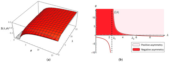 Due to the complexity though, a more detailed procedure for calculating the skewness coefficient will be omitted, while the 3D plot of its dependence in relation to is given in the following Figure 4a. For instance, when , the following is obtained: