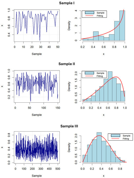 Realizations of all the above series, along with their empirical distributions, can be seen in Figure 8, while their descriptive statistical analyses are presented in the following Table 4. As can be easily seen, the empirical distribution of Series A is negatively skewed, where it extends from a quarter of a unit interval. On the other hand, Series B has a significantly positively skewed distribution, with a smaller range of values, but also with a pronounced peak, that is, an elongated distribution. Finally, Series C has a negatively skewed distribution and the highest data range, spanning into entire unit intervals. In addition, let us emphasize once again that the length and shape of the empirical distributions of these series are chosen to be similar to the simulated samples discussed in previous Section 4.