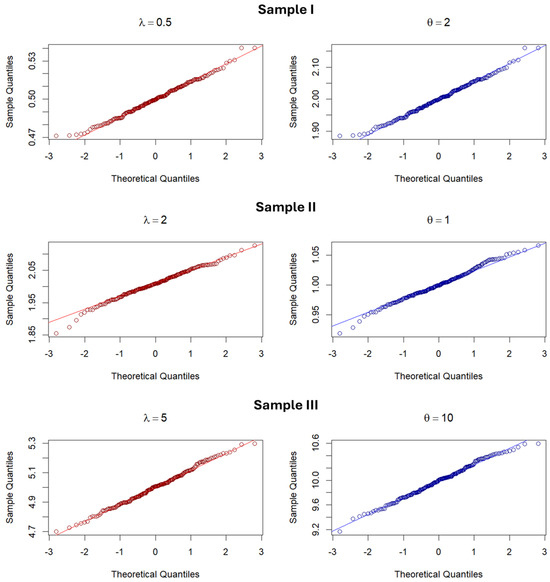 The upper parts of Table 1, Table 2 and Table 3 contain the summary statistics of the ML estimates, i.e., minimums (Min), mean values (Means), maximums (Max), standard deviations (SD), the mean-square (MSEE) and fractional estimation errors (FEE). Based on this, we can note that ML estimators are efficient because SD, MSEE, and FEE values decrease with increasing sample size, that is, there is a convergence of ML estimation methods. At the same time, it can be observed that the ML estimates for both parameters and in most cases exhibit the properties of stability and asymptotic normality (AN). In that aim, the lower parts of Table 1, Table 2 and Table 3 contain the results of Anderson–Darling (AD) and Shapiro–Wilks (W) normality tests. Their test statistics, denoted by AD and W, respectively, as well as the corresponding p-values are computed using the R-package “nortest” [30]. The results obtained in this way confirm that the AN property, given by Equation (11), is confirmed for ML parameter estimates in almost all cases. Confirmation of these can also be seen in the right panels of Figure 6, where the empirical distributions of some samples are shown along with the appropriate fitted PDFs. Furthermore, in order to compare the distribution of thus-obtained estimates with the Gaussian distribution, Q-Q plots of both parameters for samples of size are shown in Figure 7.