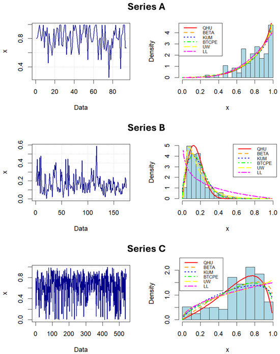 Based on that, it is evident that MSEE, AIC, BIC, and HQIC values are generally lower in the case when the QHU distribution is applied as the appropriate fitting model. Furthermore, in the case of Series A, the hypothesis of equivalence of the empirical and fitted distributions is not rejected only for the QHU, Beta, and Kumaraswamy distributions. Nevertheless, the QHU model outperformed the Beta and Kumaraswamy distributions in terms of all error statistics. Then, for Series B, all theoretical distributions except the LL distribution can be used as appropriate fitting models. This also indicates the advantage of the proposed QHU distribution, which is like the LL distribution derived from the Lindley distribution but has significantly greater flexibility in modeling this dataset. Finally, when it comes to Series C, only for the QHU distribution was the hypothesis of asymptotic equality of the empirical and fitted distributions not rejected. In that way, the QHU distribution allows for flexible behavior near the boundaries of the unit interval, making it suitable for datasets like Series C, where values span the entire unit interval. Some confirmation of this can be seen in the right panels of Figure 8, where the empirical and fitted distributions of all datasets are shown, and thus the relevance of generated theoretical models.