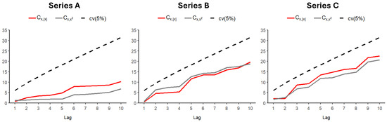 Here, , , and are the kth-order autocorrelation functions (ACFs) of some observed time series , , and , respectively, and is the sample mean. Then, by using the results reported in Dalla et al. [33], above hypotheses can be tested using the following statistics: