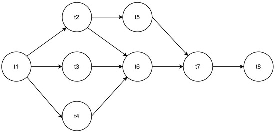 To more clearly represent the dependencies between tasks, workflows are typically depicted as a directed acyclic graph (DAG). A DAG is typically presented as , where T denotes the tasks with dependencies, and E represents the edge connecting them. Figure 1 shows a DAG workflow with eight tasks. In this figure, the task set T contains eight tasks, there are and there are nine edges in the edge set E. The direction of the edges indicates the flow of data and dependency relationships between the nodes. For example, represents that the the direction of data transfer is from node 2 to node 6. This means that node 6 must wait until the task on node 2 is completed, and the required data are transferred to node 6, before it can start executing its own task to satisfy the dependency relationship. For a child node, it can only meet the execution condition when it has received input data from all its parent nodes. For example, task 6 must wait until tasks 2, 3 and 4 have all completed their execution and transferred their output data to task 6 before it satisfies the condition for execution.