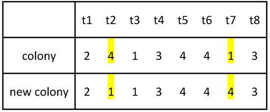 An example of a colony assimilation operation (based on Figure 1). The yellow cells represent the elements that perform the operation in the colony assimilation process.