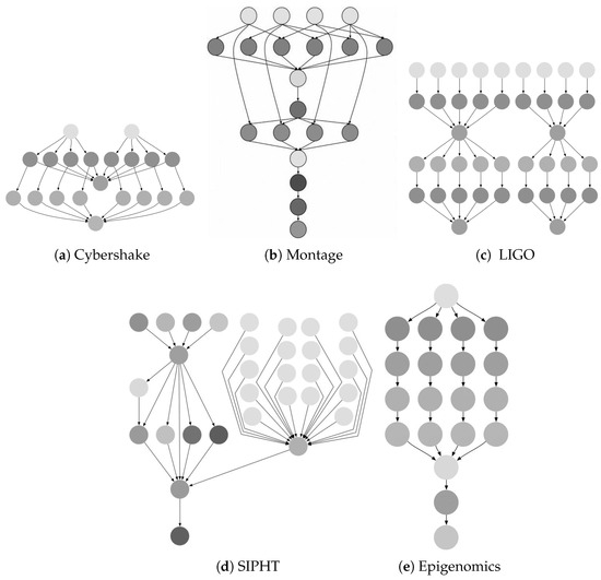 Some studies evaluate the performance of scheduling algorithms by generating random workflows. To demonstrate the capability of HICA in addressing real-world engineering problems, we adopted real scientific workflow applications, whose structures are shown in Figure 6. Specifically, CyberShake is used for earthquake prediction, Montage is applied in astronomy, LIGO is used in physics, while SIPHT and Epigenomics are applied in bioinformatics.