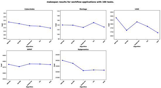 Makespan performance for 100 tasks across scientific workflows. Each subplot represents a different workflow application, and each point in the plot corresponds to the scheduling result of a different algorithm.