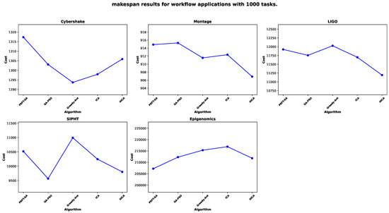 Makespan performance for 1000 tasks across scientific workflows. Each subplot represents a different workflow application, and each point in the plot corresponds to the scheduling result of a different algorithm.