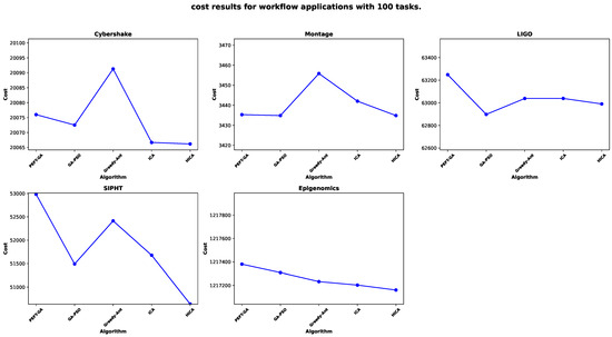 Cost performance for 100 tasks across scientific workflows. Each subplot represents a different workflow application, and each point in the plot corresponds to the scheduling result of a different algorithm.
