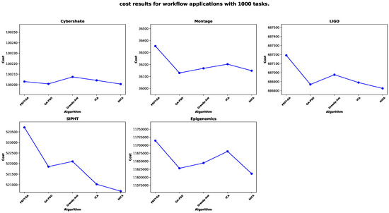 Cost performance for 1000 tasks across scientific workflows. Each subplot represents a different workflow application, and each point in the plot corresponds to the scheduling result of a different algorithm.
