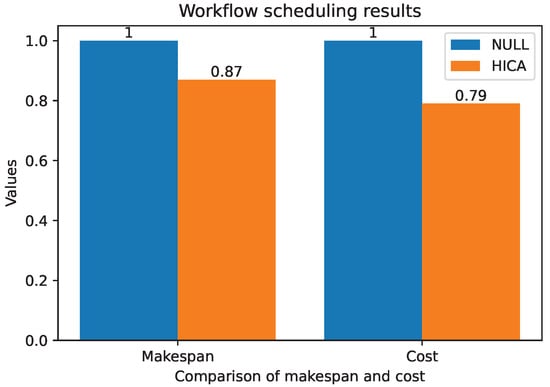 We apply the HICA algorithm proposed in this paper to parameter tuning in Earth System Models, evaluating the changes in workflow makespan and cost after introducing the scheduling algorithm. We normalize the results by using the makespan and cost in the initial scenario without any scheduling algorithm as the baseline and compare the changes after applying HICA. The results are shown in Figure 11. The HICA algorithm achieves varying degrees of improvement in both makespan and cost in workflow execution with a 13% improvement in makespan and a more significant 21% improvement in cost. These results demonstrate that the HICA algorithm not only effectively addresses the scientific workflow scheduling issues encountered in WorkflowSim but also significantly enhances the execution efficiency of workflows in specific scientific application scenarios.