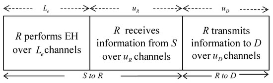 In this work, we consider a dual-hop FD relay wireless communication system illustrated in Figure 1, where a source (S) transmits information to a destination (D) with the assistance of a relay (R). We assume that direct communication from S to D does not exist due to significant distance and severe fading. Additionally, we consider a scenario where R operates without a fixed energy source and relies solely on harvesting energy from received RF signals [13,18,25]. To reduce system implementation complexity, we adopt the time switching protocol for wireless EH and information processing, as depicted in Figure 2. This protocol divides each communication process into two distinct phases: an EH phase and an information transmission phase.
