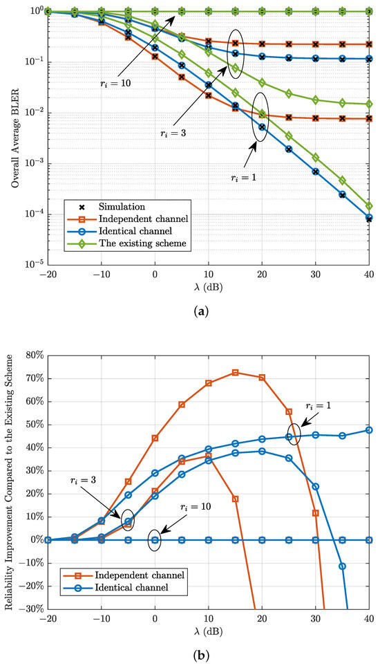(a) Overall average BLER and (b) the corresponding percentage reliability improvement compared with the existing scheme in [25] versus the transmit SNR with .