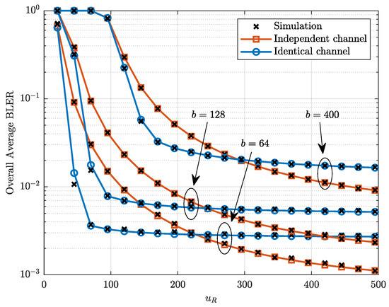 Figure 4 plots the overall average BLER versus the number of channels with dB. It can be observed from Figure 4 that the overall average BLER under the independent channel decreases gradually and slowly with the increase in , while the overall average BLER under the identical channel decreases rapidly with the increase in and remains essentially unchanged when is greater than a certain value. This phenomenon occurs because when b remains constant, increasing reduces the transmission rate, thereby enhancing the reliability of the system. Similarly, when remains constant, reducing b also improves reliability.
