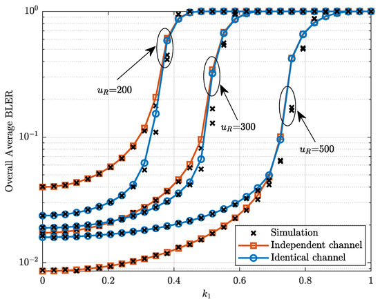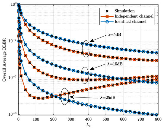 Figure 6 plots the overall average BLER versus the number of channels with . It can be observed from Figure 6 that the overall average BLER under the identical channel decreases with the increase in . However, the overall average BLER under the independent channel first decreases and then increases with the increase in when the transmit SNR is high. This phenomenon occurs due to the increase in transmit power of the relay as increases, which enhances the reliability of the destination and compromises the reliability of the relay. The trade-off relationship leads to the existence of an optimal that minimizes the overall average BLER under the independent channel, when the transmit SNR is high. However, in the case of the identical channel, the benefit of increased transmit power at the relay outweigh the drawback, leading to a continuous decrease in the overall average BLER.