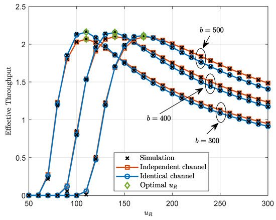 The effective throughput, as defined in [36], is derived as the transmission rate multiplied by the complementary probability of overall average BLER. Thus, the effective throughput is given by for the independent channel and for the identical channel.